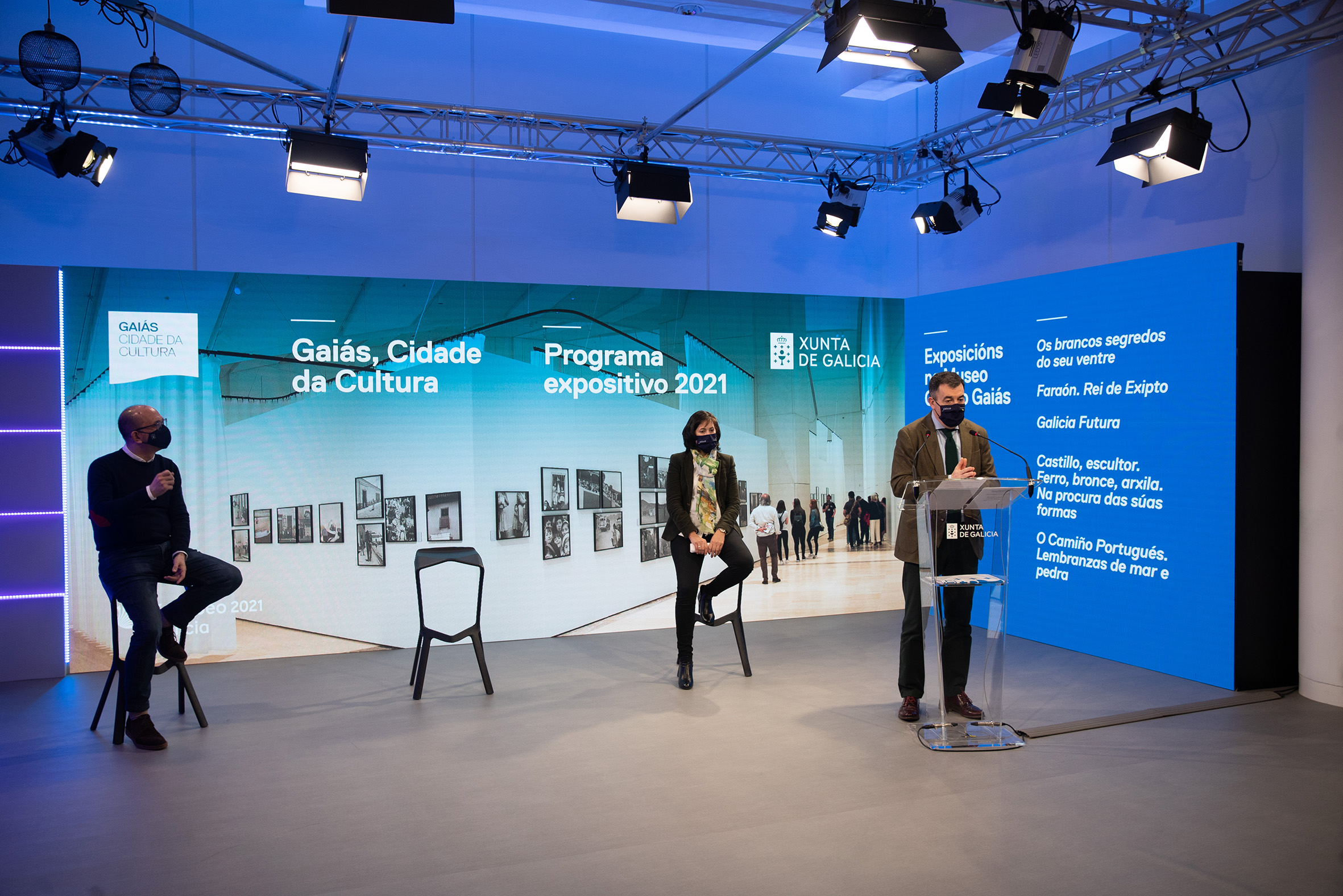 El programa expositivo para 2021 fue presentado hoy en el Museo Gaiás por el conselleiro, en un acto en el que también participaron el secretario general de Cultura, Anxo M. Lorenzo, y la directora gerente de la Fundación Cidade da Cultura de Galicia, Ana Isabel Vázquez. Coincidiendo con los diez años de la apertura al público del complejo del Gaiás, se anuncia este ambicioso programa expositivo, que incluye cinco nuevas muestras en el Museo Centro Gaiás –además de la dedicada a Isaac Díaz Pardo, que puede visitarse actualmente–, ocho en la Biblioteca y Archivo de Galicia, y también siete intervenciones artísticas en los espacios verdes y en las Torres Hejduk.