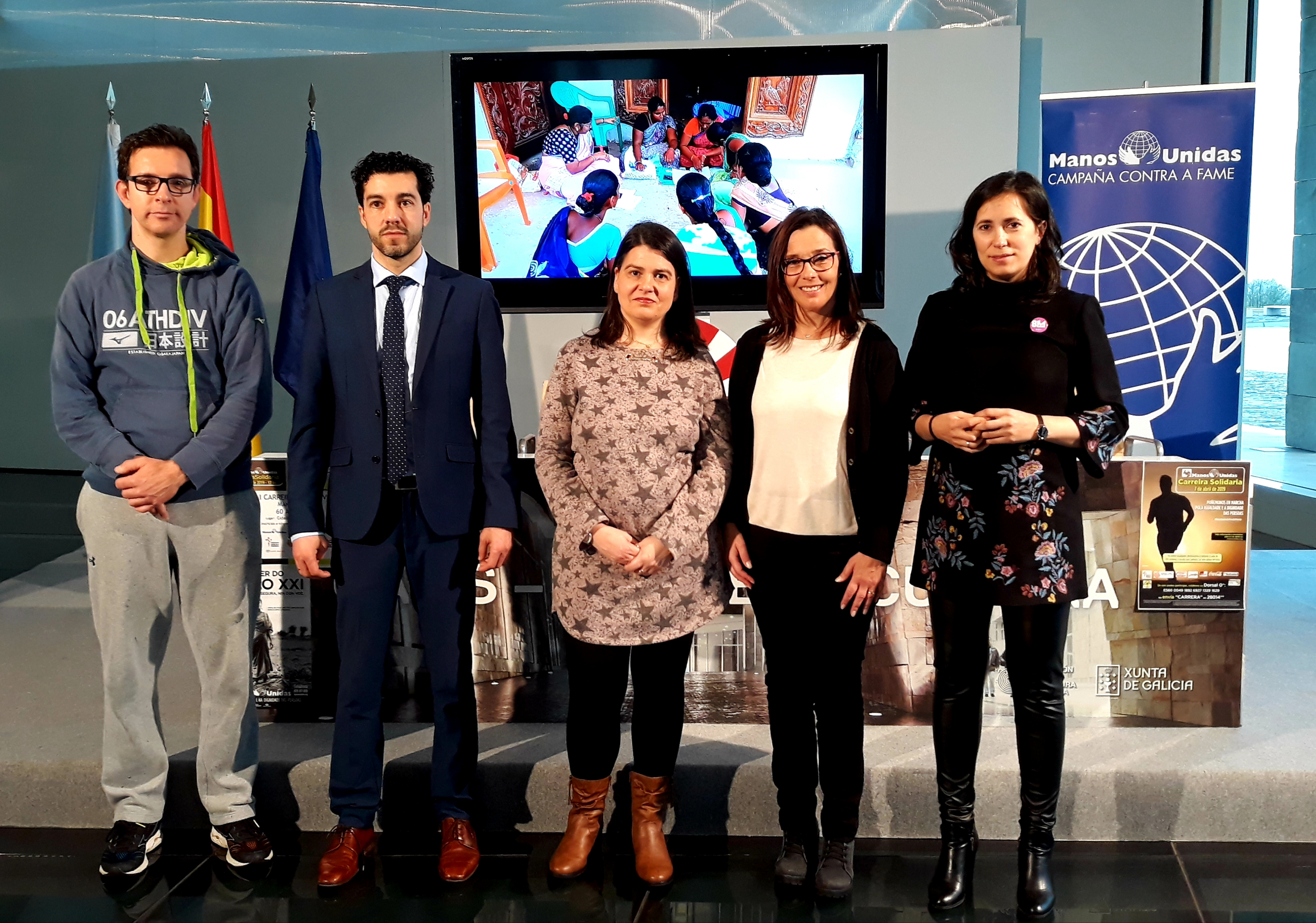 Esta actividad, cuya recaudación irá destinada a un programa de emprendimiento para mujeres vulnerables en la India, fue presentada hoy en el Gaiás por la directora gerente de la Cidade da Cultura, Ana Isabel Vázquez Reboredo, junto a la presidenta-delegada de Manos Unidas en Galicia, Judith Lucachesky, acompañadas del delegado de la Federación Gallega de Atletismo en Santiago, Iván Sanmartín Carreira, y el presidente del Club de Atletismo de Santiago, Alfonso López Menduiño, que colaboran en esta carrera.