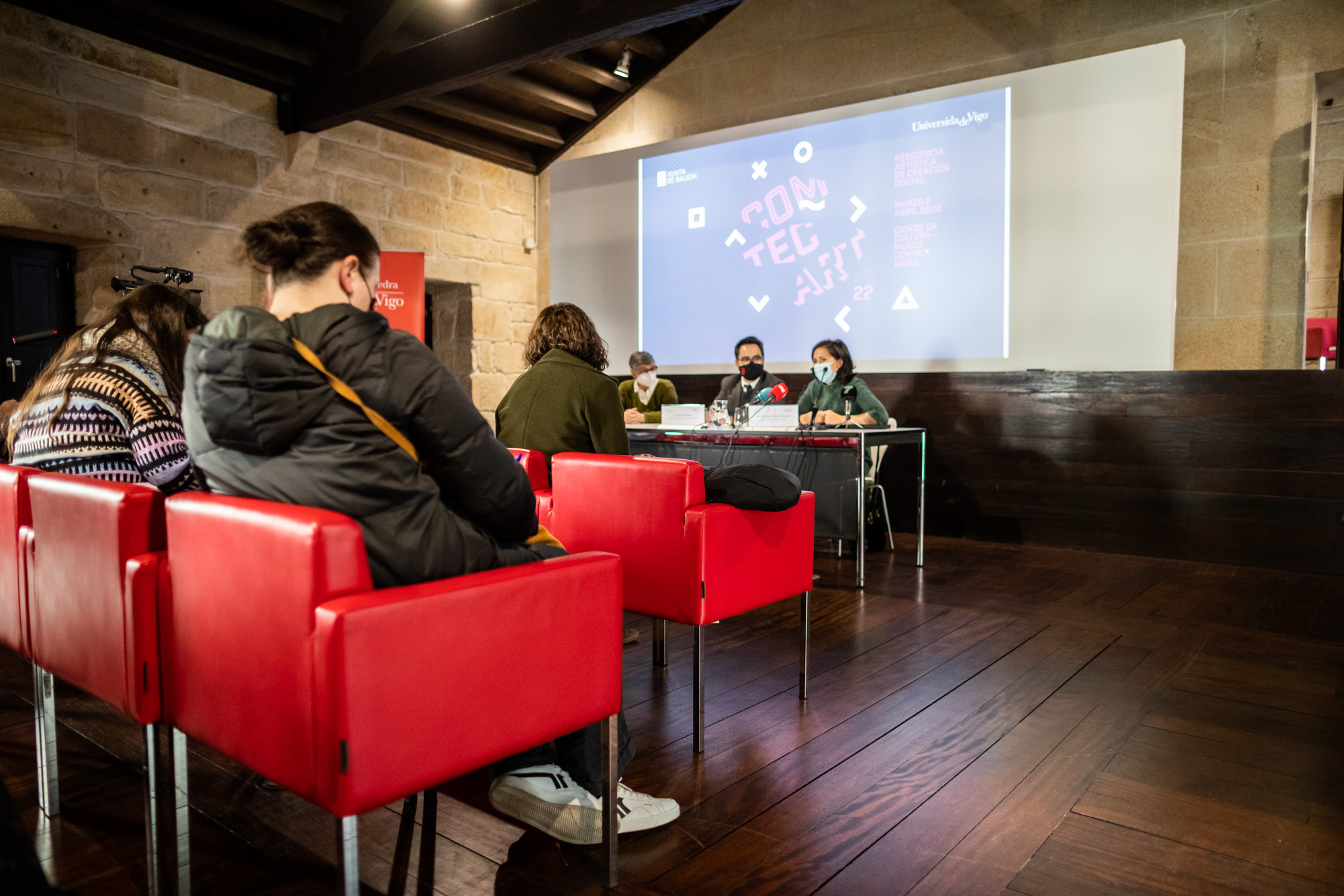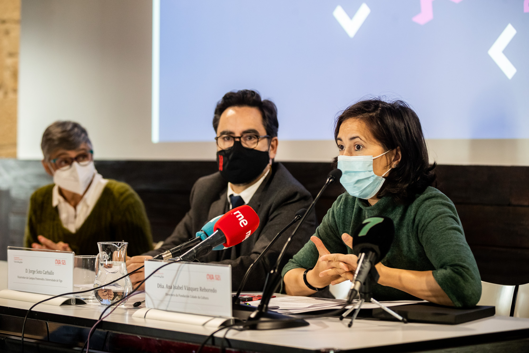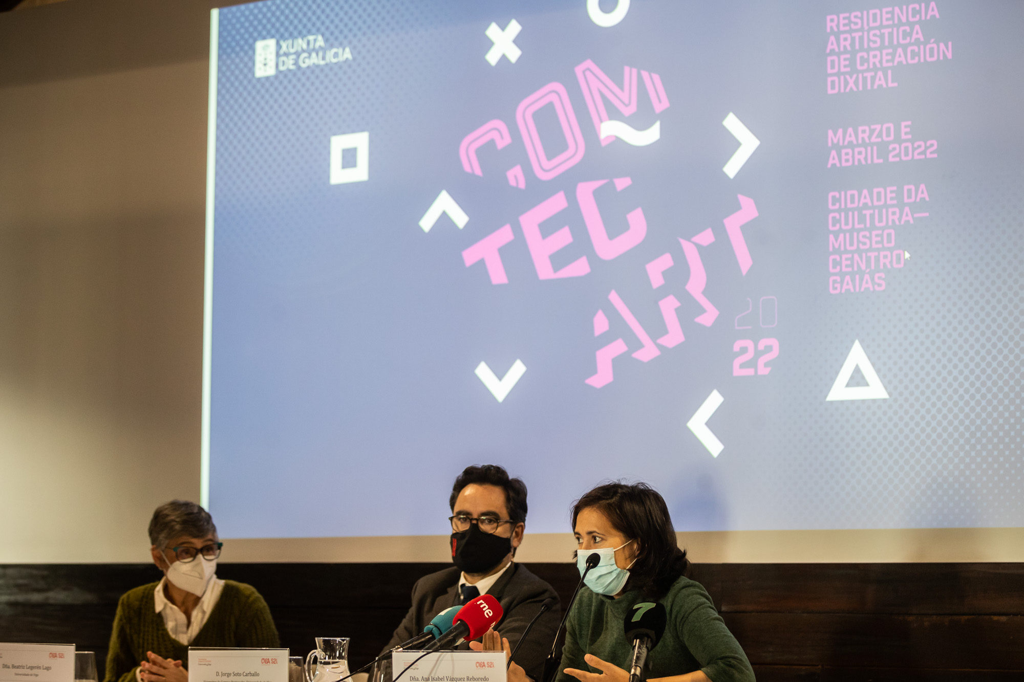 La directora gerente de la Cidade da Cultura, Ana Isabel Vázquez, presentó hoy la convocatoria acompañada del vicerrector del Campus CREA de Pontevedra, Jorge Soto, y de la profesora de la Universidad de Vigo Beatriz Legerén, miembro del grupo de innovación educativa COMTECART del que toma su nombre esta residencia creativa.