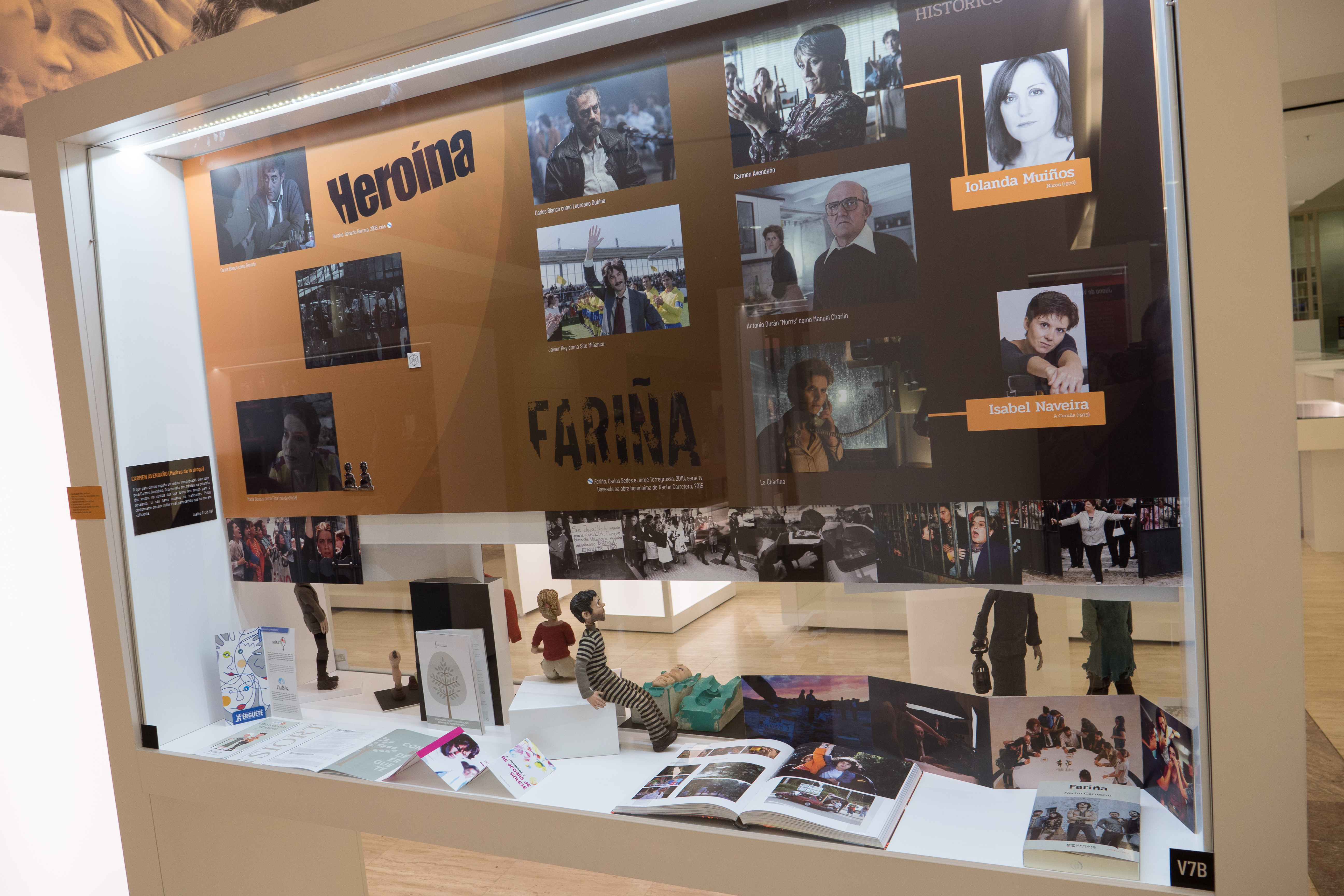 Por su parte, la construcción y expansión del Camino de Santiago protagoniza el arranque del apartado que Recreando personaxes le dedica de manera específica a la historia, con títulos como El final del Camino, Camino de Santiago: O final do Camiño, Camiño de Santiago: A orixe ou o filme de animación O Apóstolo. En las vitrinas y paneles de esta sección, también hay lugar para dos trabajos televisivos ambientados en la Galicia de finales del XVIII (Hospital Real) y en la posguerra y dictadura franquista (Os fillos do sol), así como para un vistazo social hacia nuestro pasado más reciente con el filme Heroína y la serie Fariña.