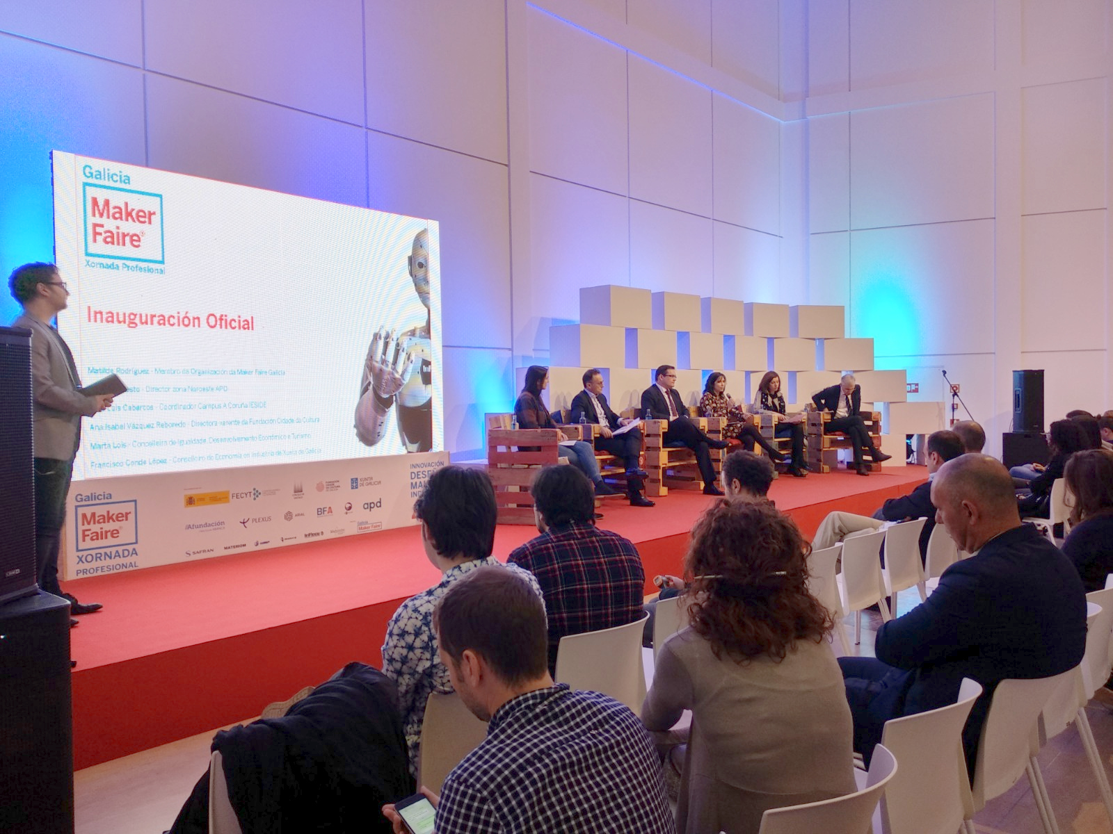 El conselleiro de Economía, Emprego e Industria, Francisco Conde, acompañado de la directora-gerente de la Fundación Cidade da Cultura, Ana Isabel Vázquez Reboredo, participaron en la inauguración de la jornada, en un acto en el que también estuvieron la concelleira de Igualdade, Promoción Económica e Turismo del Concello de Santiago, Marta Lois, el director de APD Zona Noroeste, Santiago Sesto, el coordinador del Campus A Coruña de IESIDE, José Luis Cabarcos y Matilde Rodríguez, co-organizadora de la Maker Faire Galicia.