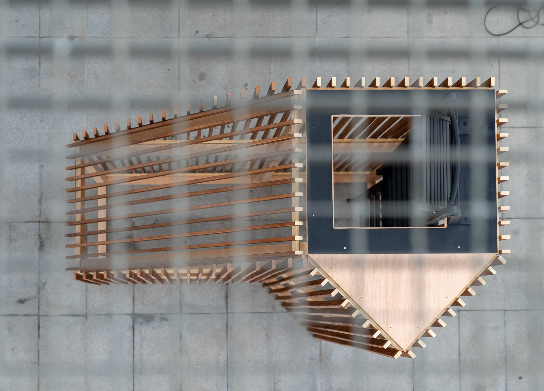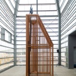 Stay here es una pieza escultórica, a modo de torre coronada por una cadera rogada, que convierte las edificaciones ideadas por John Hejduk –y construidas por Peter Eisenman en el Gaiás a modo de homenaje– en una especie de ingeniosa matrioska, que invita a la participación de quien la ve, tanto en su posible manejo como en sus múltiples lecturas sobre la sociedad actual: el excesivo fomento del individualismo (una única silla); el poder (solo una persona puede sentarse y en la cumbre) o el estatus social (perspectiva desigualitaria, por encima del resto).