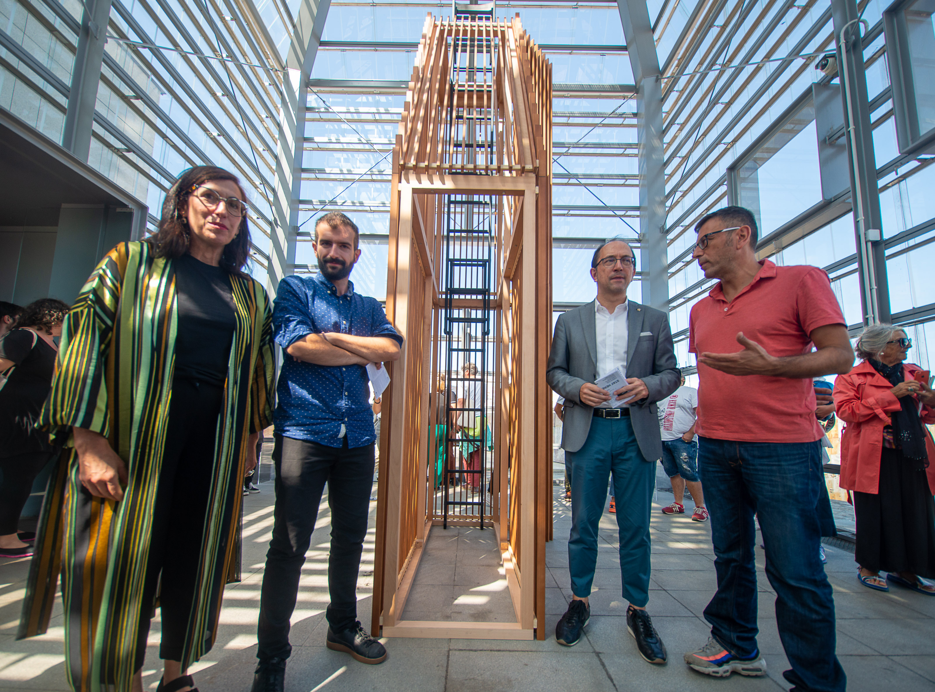 El director general de Políticas Culturales, Ángel M. Lorenzo, asistió a la inauguración de la pieza que supone, su vez, el cierre de la edición de este año del IX Encontro de Artistas Novos, que cuenta con la colaboración de la Fundación Banco Sabadell, tras cinco días de residencia artística en la Cidade da Cultura de Galicia. Por eso, en su intervención animó a los 40 artistas participantes a presentarse a la nueva convocatoria vinculada con el Xacobeo 21 como “una oportunidad” y desafío “creativa”, tanto por celebrarse en un espacio expositivo no convencional –como son las torres Hejduk– cómo por la nueva temática alrededor del Camino de Santiago.