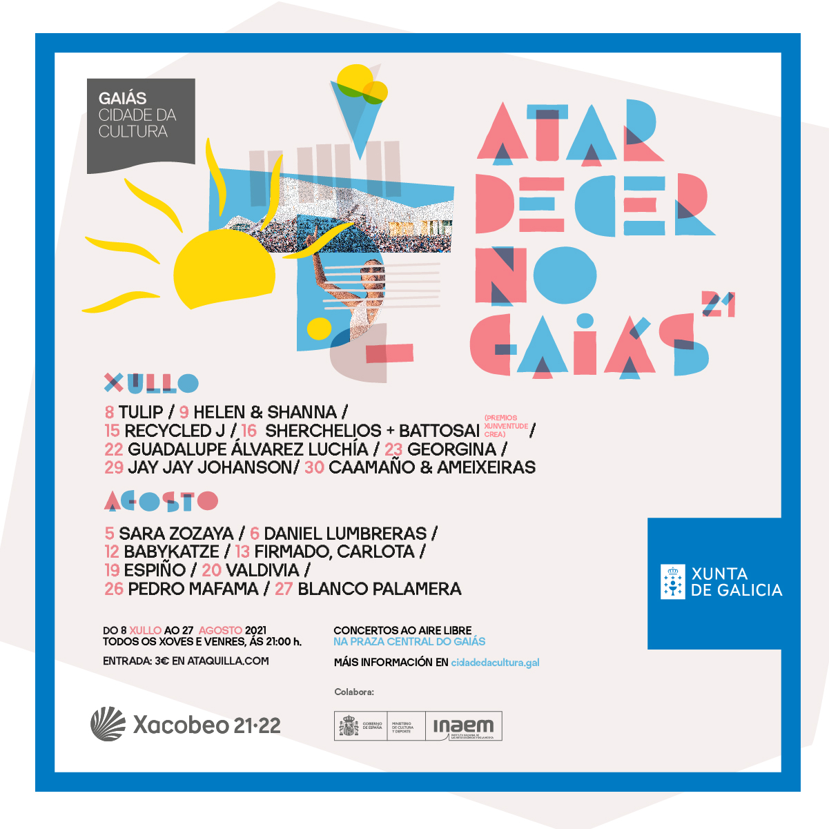 Tal y como acontecía en ediciones anteriores, Atardecer no Gaiás se celebra en la plaza central de la Cidade da Cultura a las 21,00 horas. Las entradas para cada concierto tienen un precio de 3 euros y se ponen a la venta cada semana a través de la plataforma web de ataquilla.com
