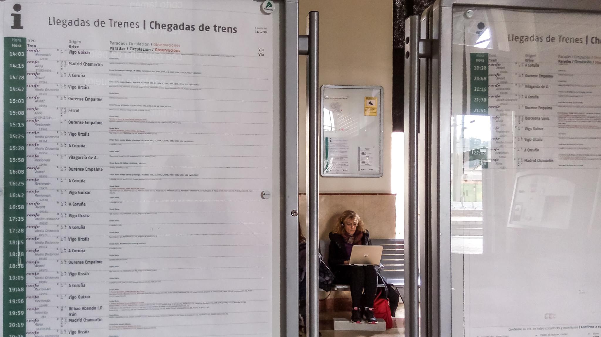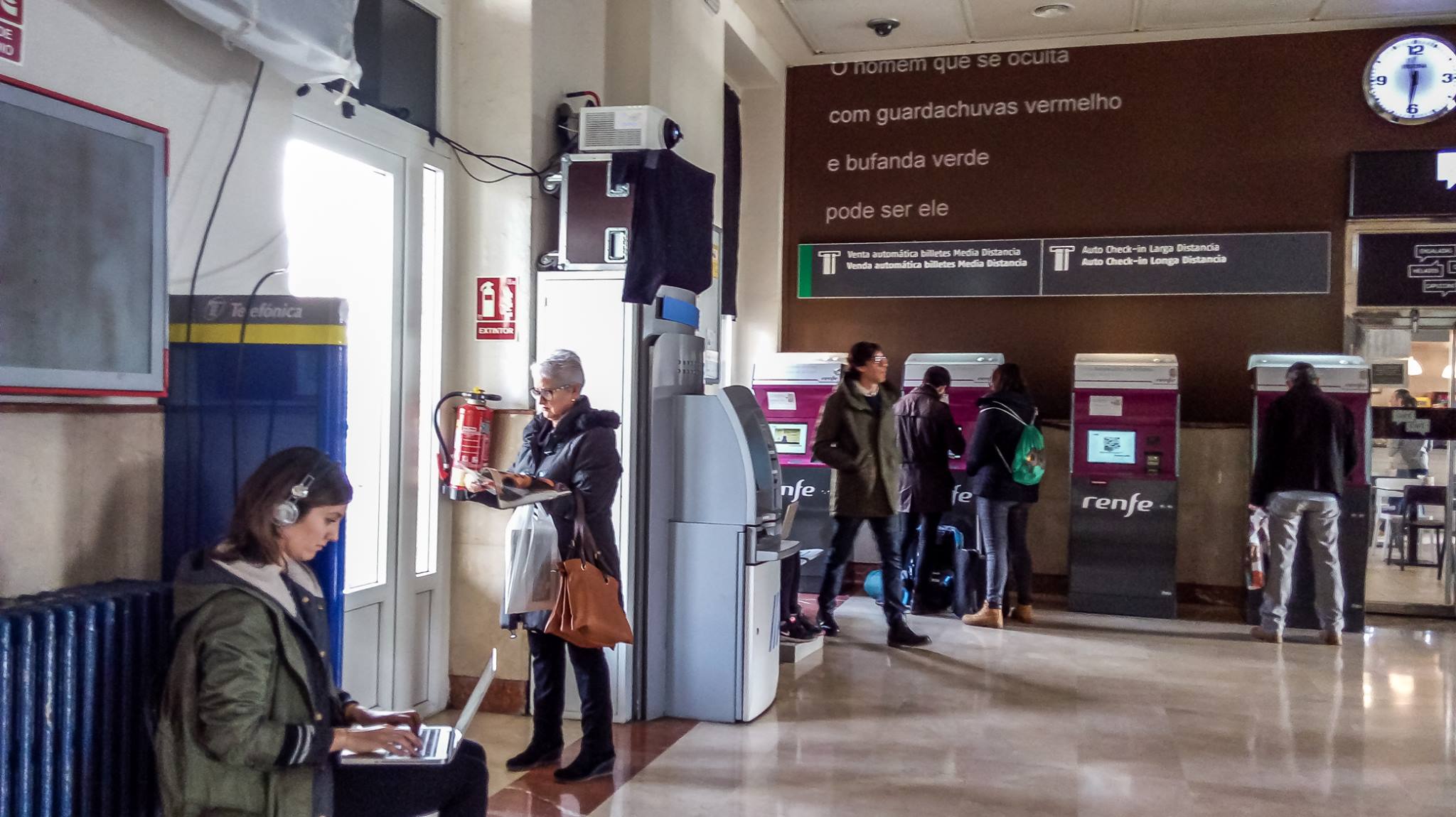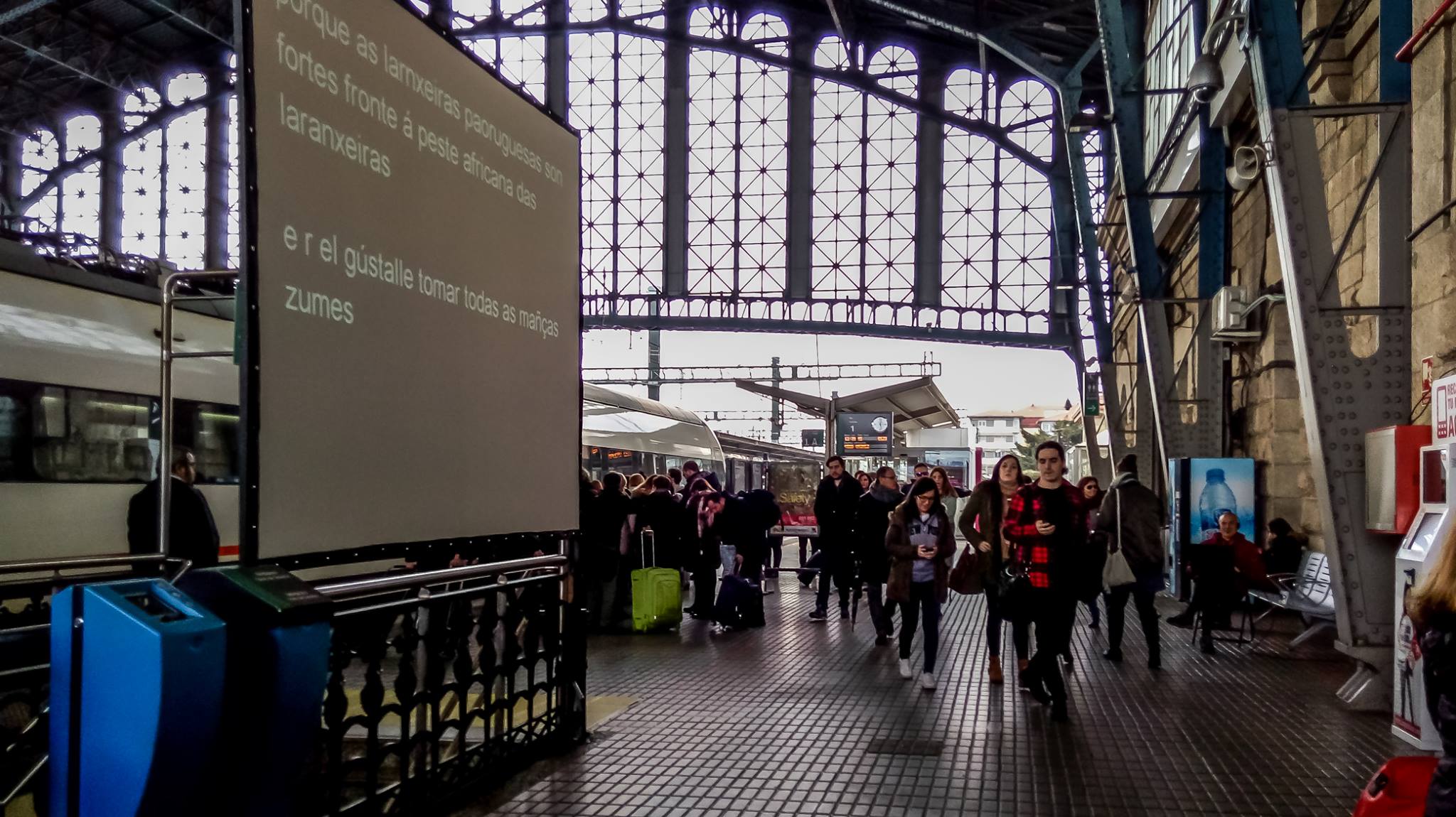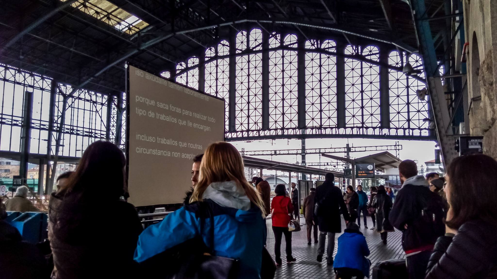 La estación de tren de Compostela se convirtió hoy en un improvisado escenario teatral con el preestreno de la obra A veces creo que te veo del argentino Mariano Pensotti, con la que Escenas do Cambio, festival de teatro, danza y arte en acción de la Ciudad de la Cultura dio comienzo esta mañana. De la mano de los escritores gallegos Teresa Moure, Antía Otero, Carlos Santiago y Antón Lopo, la estación se convirtió en una suerte de papel en la que se “escribió” una novela en vivo, involucrando a los usuarios de la estación.