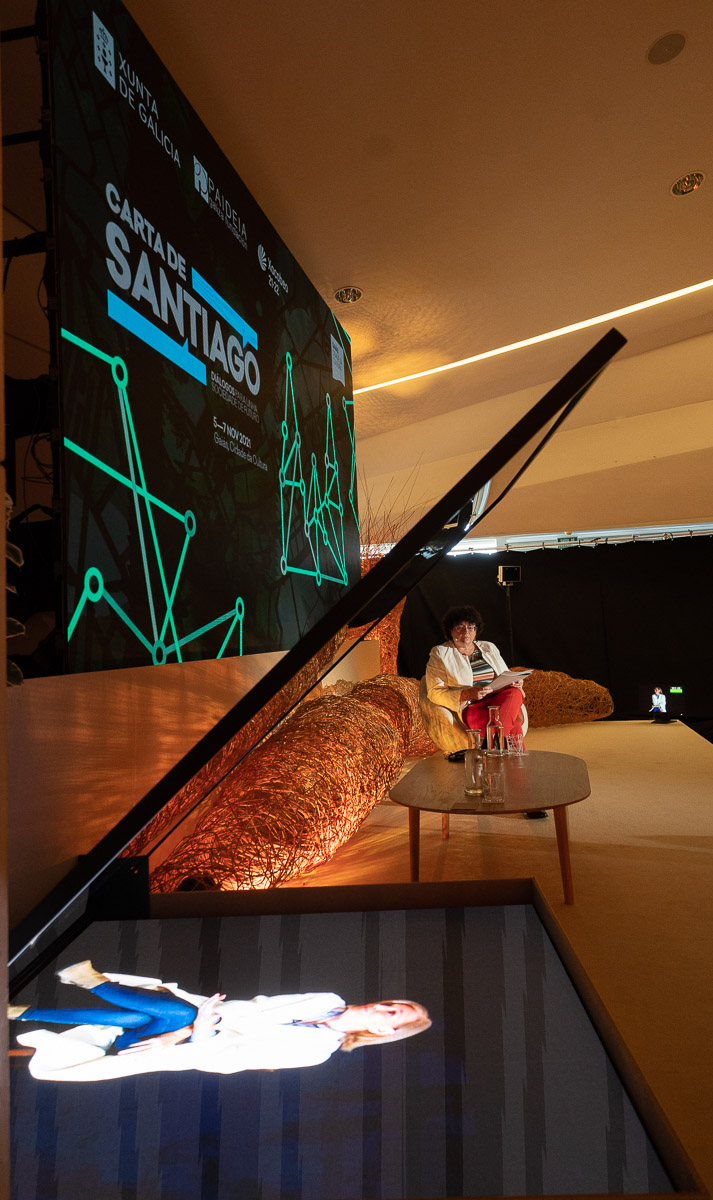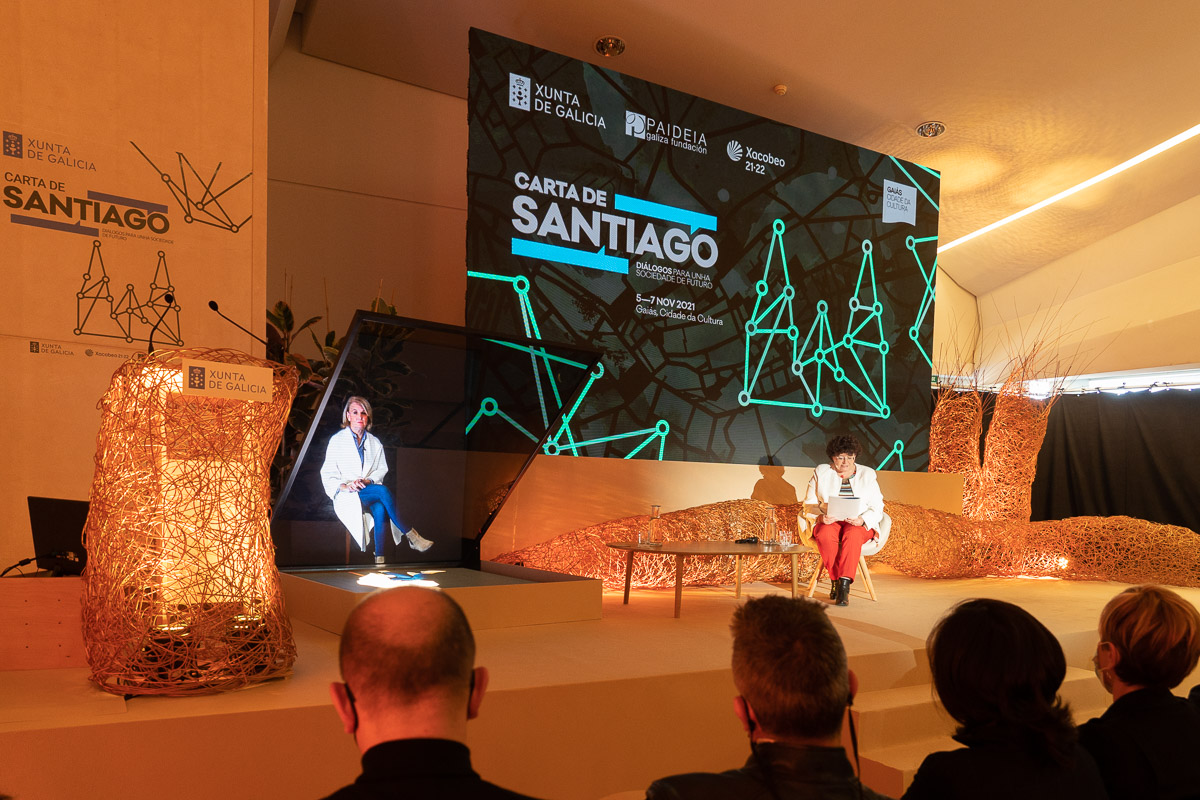 Pese a ter que facelo a distancia desde Glasgow –onde asiste á Conferencia das Nacións Unidas sobre cambio climático– a representante da OMS conectou con Santiago de Compostela a través dunha proxección holográfica para poder participar en Carta de Santiago. Na súa intervención, a especialista en saúde pública animou a “loitar para que en Glasgow se tomen decisións reais e non se fagan só anuncios publicitarios” e demandou tamén un compromiso para “deixar de empregar o planeta como vertedoiro”, advertindo que “os compoñentes do lixo electrónico que estamos a xerar rematan no noso cerebro”.