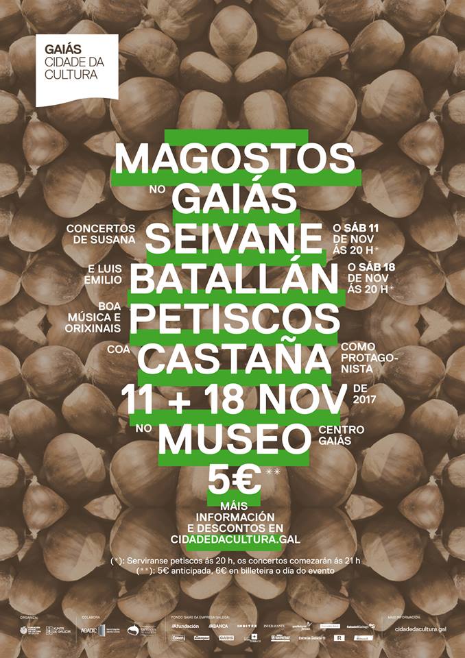 A Cidade da Cultura de Galicia convida este ano a gozar non dun, senón de dous Magostos no Gaiás, os vindeiros 11 e 18 de novembro, coa música de Susana Seivane e Luís Emilio Batallán, respectivamente, grazas á colaboración da AGADIC; e cunha protagonista que nunca pode faltar, a castaña. Desta vez, degustarase dun xeito orixinal, en diferentes petiscos que a levarán como ingrediente principal coa colaboración da Indicación Xeográfica Protexida Castaña de Galicia.
