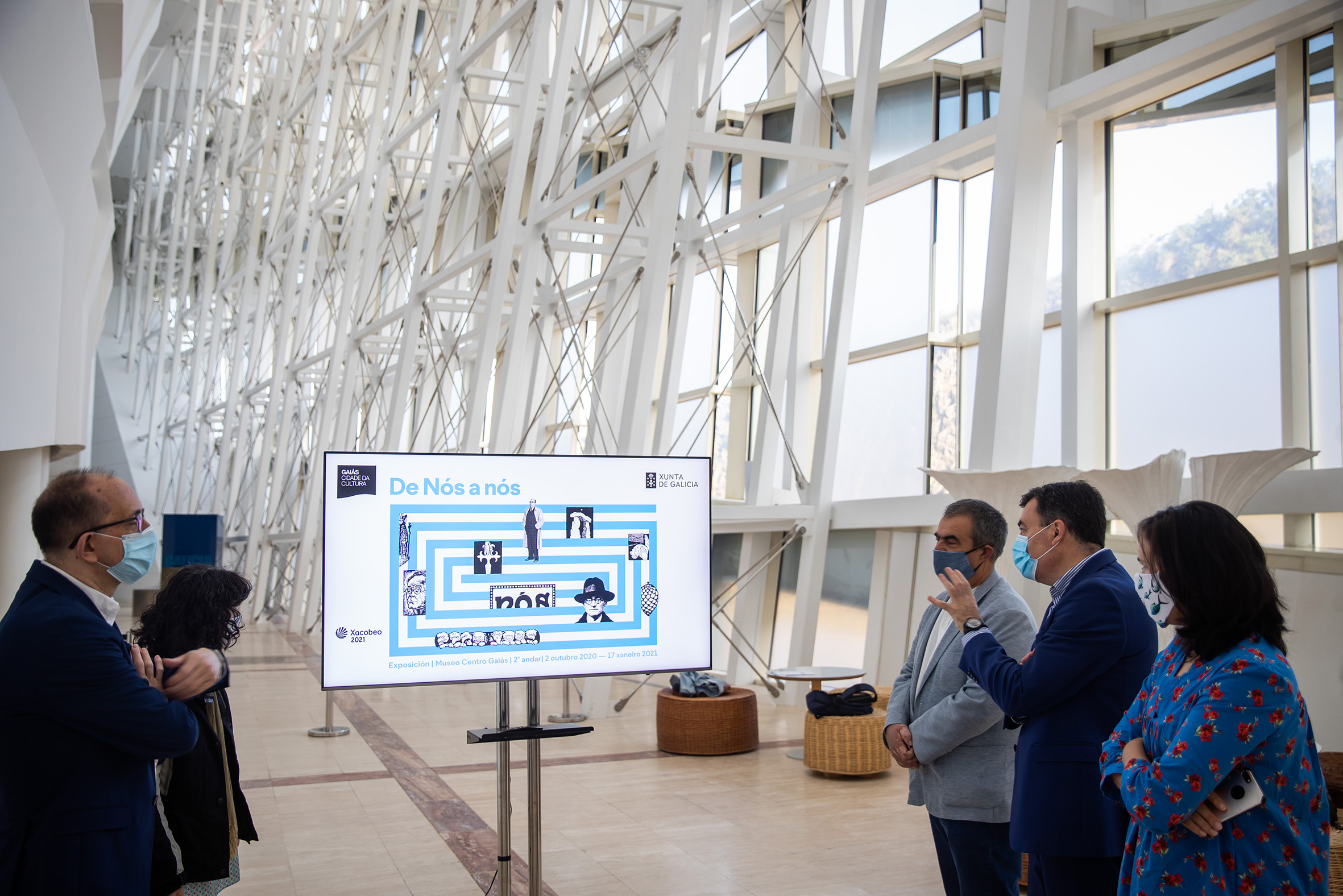 Galicia de Nós a nós será a segunda gran exposición do Xacobeo 2021 –tras Galicia, un relato no mundo– e inaugurarase a comezos do mes de outubro, despois de que tivese que ser reprogramada a data inicial –prevista para esta primavera– polos efectos da crise sanitaria da covid-19. O conselleiro de Cultura e Turismo, Román Rodríguez, e o director xeral de Políticas Culturais, Anxo Lorenzo, participaron nunha reunión de traballo cos comisarios da exposición –o investigador e académico da Real Academia Galega (RAG) Afonso Vázquez Monxardín e a profesora e investigadora da Universidade de Vigo Ana Acuña– e coa directora xerente da Fundación Cidade da Cultura, Ana Isabel Vázquez Reboredo.