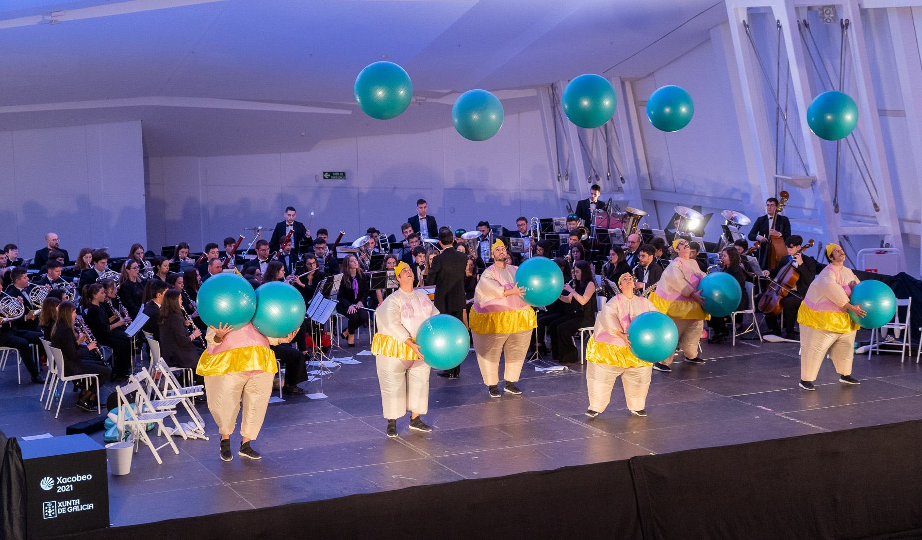 A música e o circo foron os grandes protagonistas esta tarde na Cidade da Cultura co espectáculo Orquestra de malabares, un proxecto da banda Unión Musical de Meaño e a compañía galega de novo circo Pistacatro. Dirixido especialmente a público infantil e familiar, este diálogo escénico entre seis malabaristas e unha banda de música congregou no Museo Centro Gaiás a un público de máis de 400 persoas no primeiro dos espectáculos programados con motivo dos festexos do Nadal no Gaiás. O evento contou tamén coa asistencia do director xeral de Políticas Culturais, Anxo M. Lorenzo.