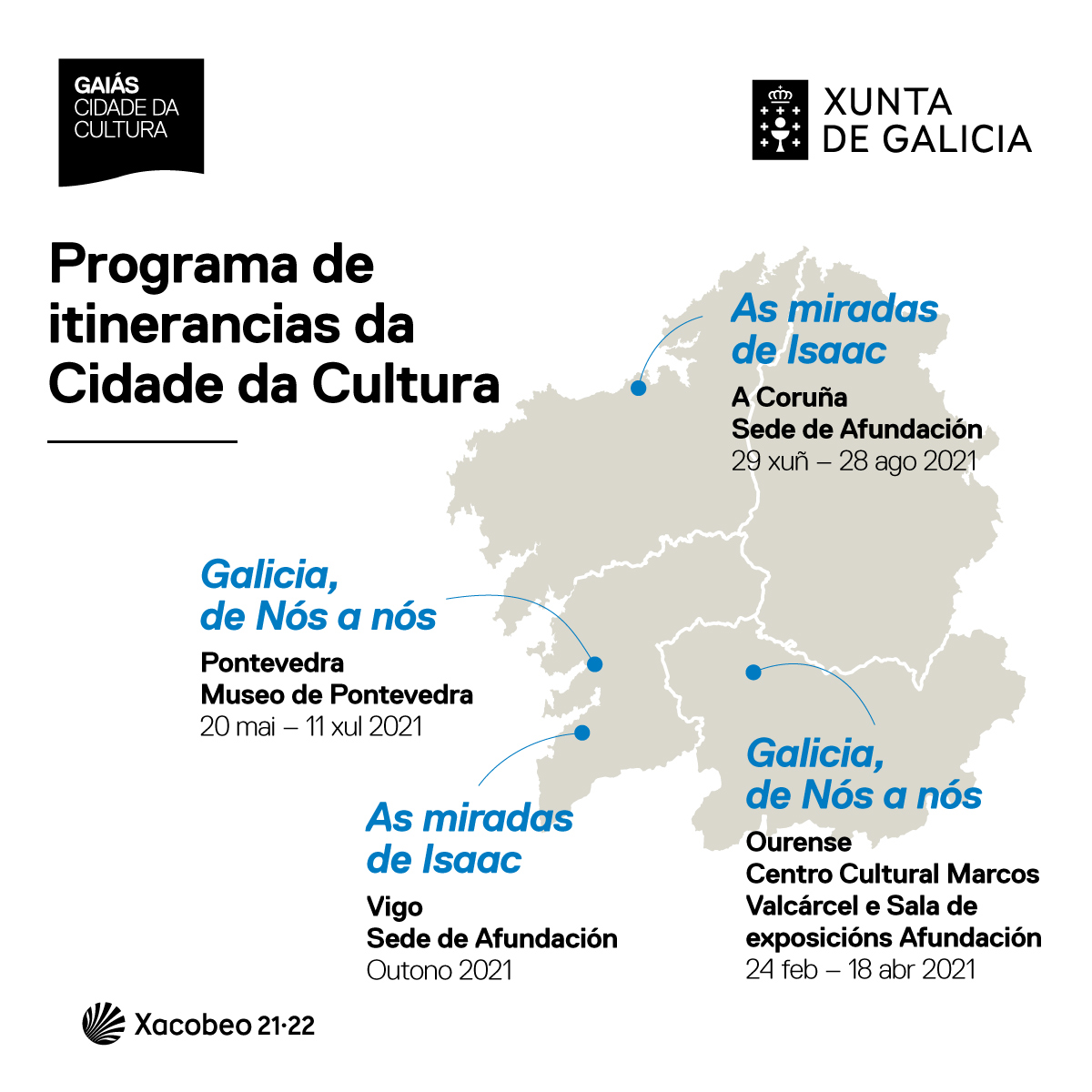 A Xunta de Galicia e Afundación levan á Coruña do 29 de xuño ao 28 de agosto As miradas de Isaac, exposición coa que se procura difundir a figura de Díaz Pardo e que durante os seis meses de exhibición na Cidade da Cultura en Santiago de Compostela —do 26 de novembro ao 30 de maio de 2021— foi visitada por máis de 26.000 persoas.