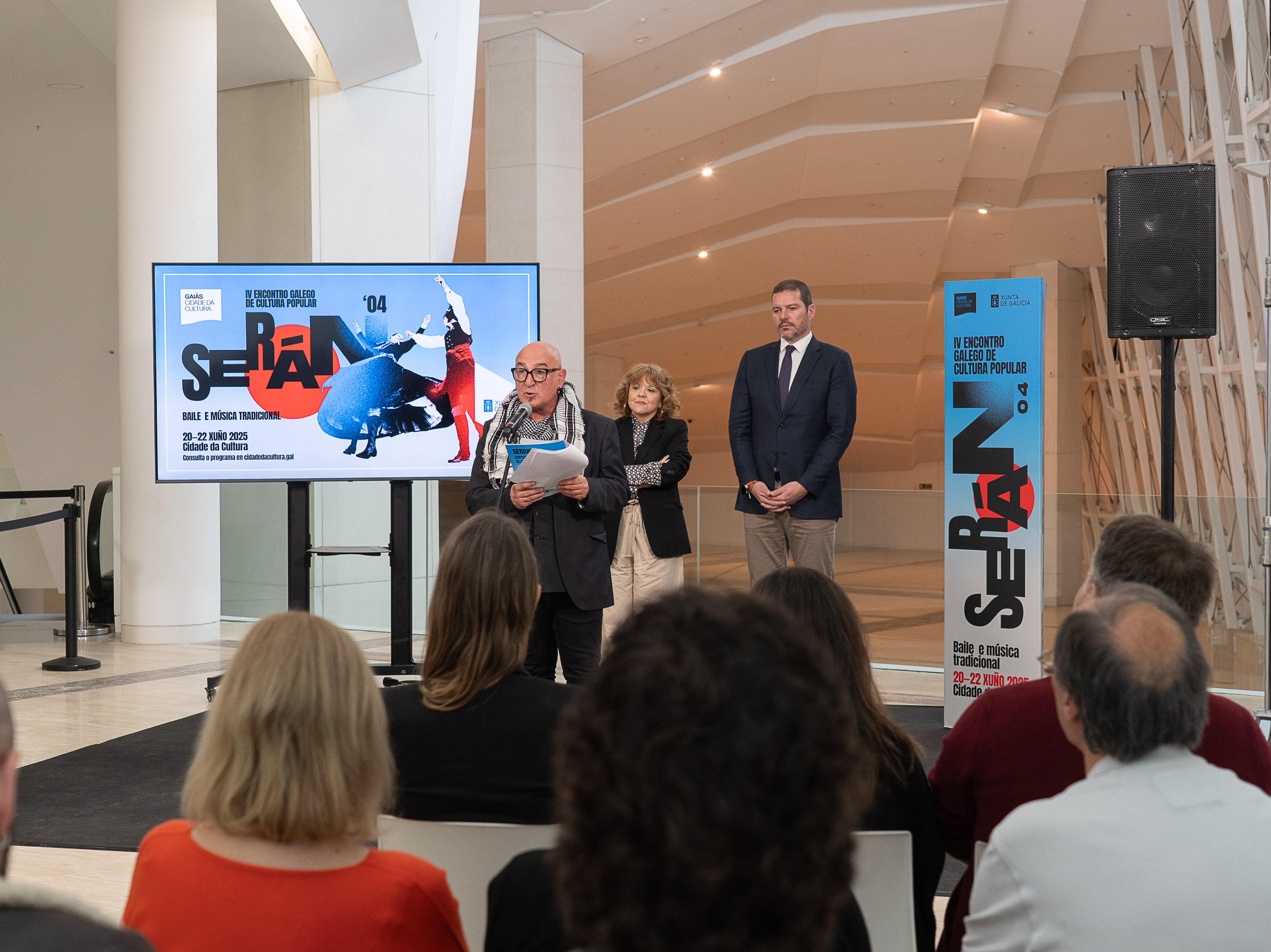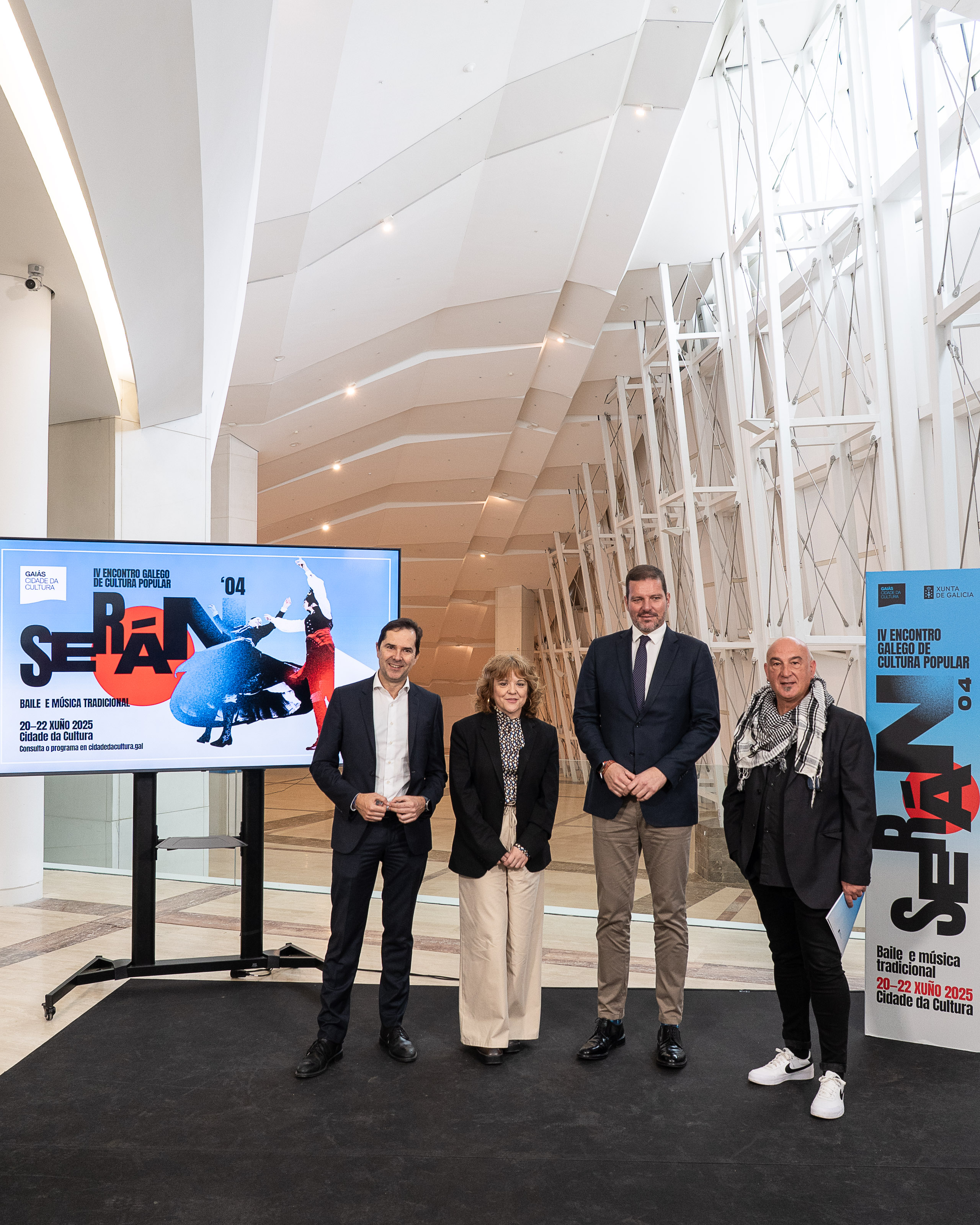 O acto de presentación do Serán’04 contou tamén coa participación do director artístico do encontro, o coreógrafo, investigador, intérprete e docente no ámbito da música e a danza tradicional galega, Henrique Peón; o director da Axencia Galega das Industrias Culturais, Jacobo Sutil ; e a directora de Acción Cultural da Cidade da Cultura, Verónica Santos.