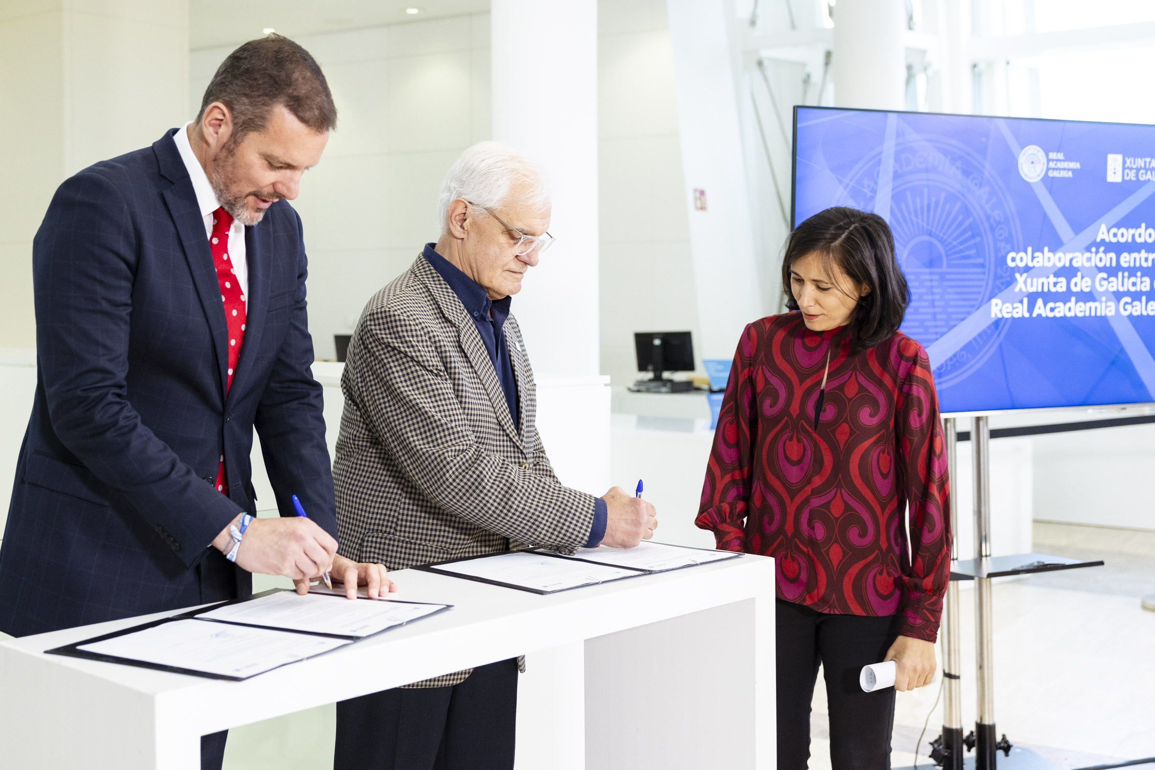 Neste acto de sinatura estiveron tamén presentes o secretario xeral de Política Lingüística, Valentín García, o director xeral de Cultura, Anxo Lorenzo, a directora xerente da Cidade da Cultura, Ana Isabel Vázquez, e o vicesecretario da RAG, Henrique Monteagudo.