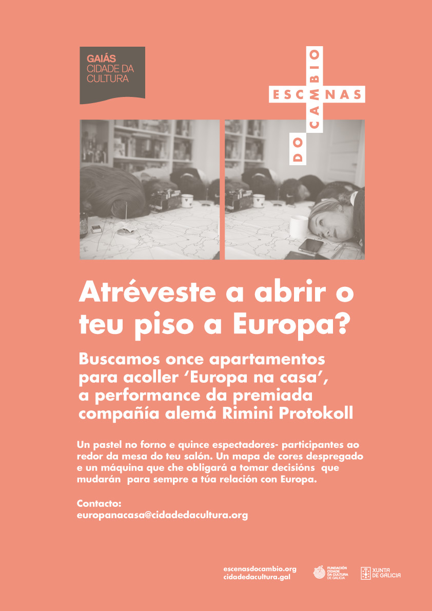 Os interesados en converterse en anfitrións ofrecendo a súa casa poderán facelo enviando un correo a europanacasa@cidadedacultura.org. Os que prefiran vivir esta experiencia como público poden mercar xa as entradas en www.escenasdocambio.org e o mesmo día da función recibirán un whatsapp e un mail no que se lles informará do punto exacto no que deben presentarse para participar. O aforo máximo por sesión é de 15 persoas.