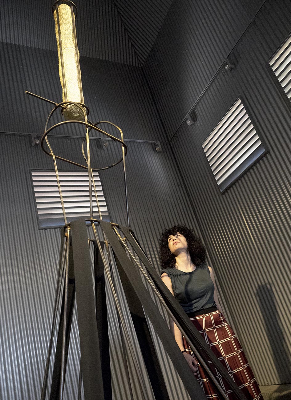 Sonia Navarro busca así un enfrontamento de contrarios, xa que por un lado “ispe” as gaiolas, desposuíndoas de todo elemento superficial, fala do silencio encerrado que simboliza un desexo de liberdade e de desfacer ataduras co pasado. Polo outro, na torre opaca, propón vestir a gaiola recorrendo a técnicas artesanais empregadas na indumentaria tradicional galega como poden ser as usadas na realización dos sancosmeiros, feitos con palla de centeo trenzada. Para iso, Navarro traballou conxuntamente coa artesá María Sieira Velo, unha das poucas mulleres que continúa con esta tradición familiar na Serra de Outes.