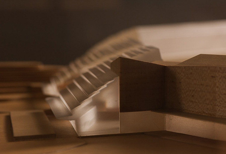El suelo donde se asienta está modelado en socalcos que se adaptan perfectamente a las terrazas naturales. En el proyecto, las piezas se disponen atravesando y rodeando el territorio, fijando niveles, marcas horizontales que se extienden sobre todo el conjunto y que son indicadores de lo artificial como grandes uniones en la topografía.