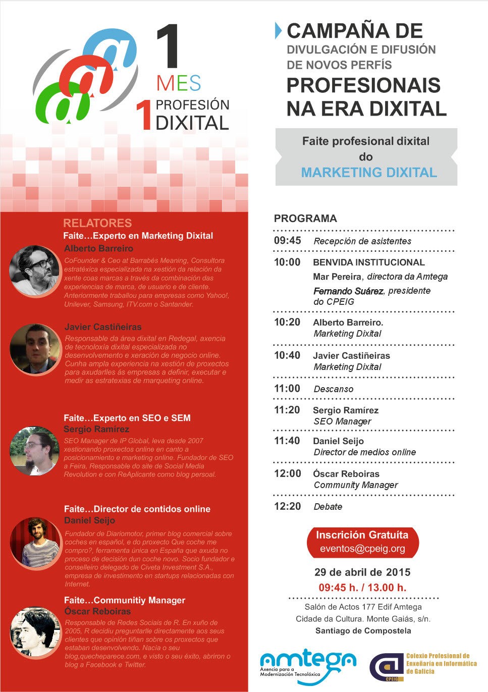 Esta jornada tendrá lugar el 29 de abril y contará con ponentes con una amplia experiencia en este campo como Rubén Bastón, director de Marketing y Comunicación de Elogia; Alberto Barreiro, CoFounder & CEO de Barrabés Meaning; Fernando Gómez, CEO del Grupo Predomina y Mundobebes.net; Daniel Seijo, socio fundador y director de Diariomotor/Quecochemecompro; y Celso Gómez, community manager del Talaso Atlántico.