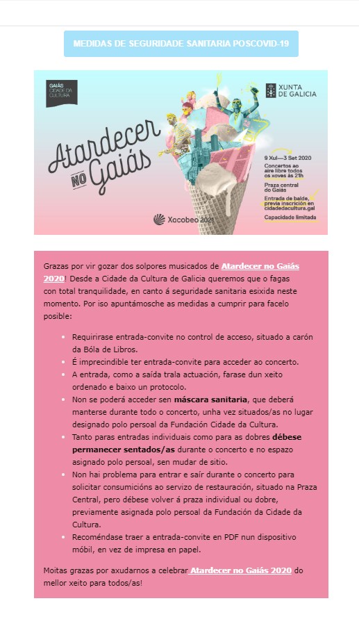 He aquí una nueva edición de ¡Atardecer no Gaiás! Anhelábamos ponerle música a los atardeceres del verano, aunque estemos en una época estival diferente. Por eso, el ciclo de conciertos gratuítos al aire libre de la Cidade da Cultura se adapta en esta ocasión a lo que 'la nueva normalidad' nos exige; formatos más pequeños reduciendo la capacidad de asistencia para disfrutar de esta experiencia con la seguridad de que se están cumpliendo las medidas sanitarias de protección y de distancia social.