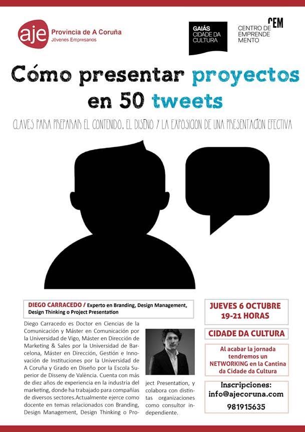 AJE Coruña celebra este jueves en el Centro de Emprendemento del Gaiás Como presentar proyectos en 50 tweets, donde se darán las claves para preparar el contenido, el diseño y la exposición de una presentación efectiva. La sesión estará conducida por el experto en Branding, Design Management, Design Thinking y Project Presentation, Diego Carracedo. Y al acabar la jornada, networking en la Cantina do Gaiás.
