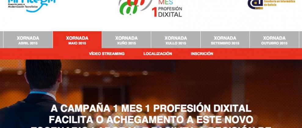 En colaboración con el Colexio Profesional de Enxeñeria Informática de Galicia (CPEIG), la Amtega está desarrollando la campaña 1 mes, 1 profesión digital con el objetivo de concienciar a la juventud y/o experimentados profesionales, de la necesidad de tener conocimientos digitales sólidos y de la evolución de estos, al mismo ritmo que lo hacen las tecnologías.