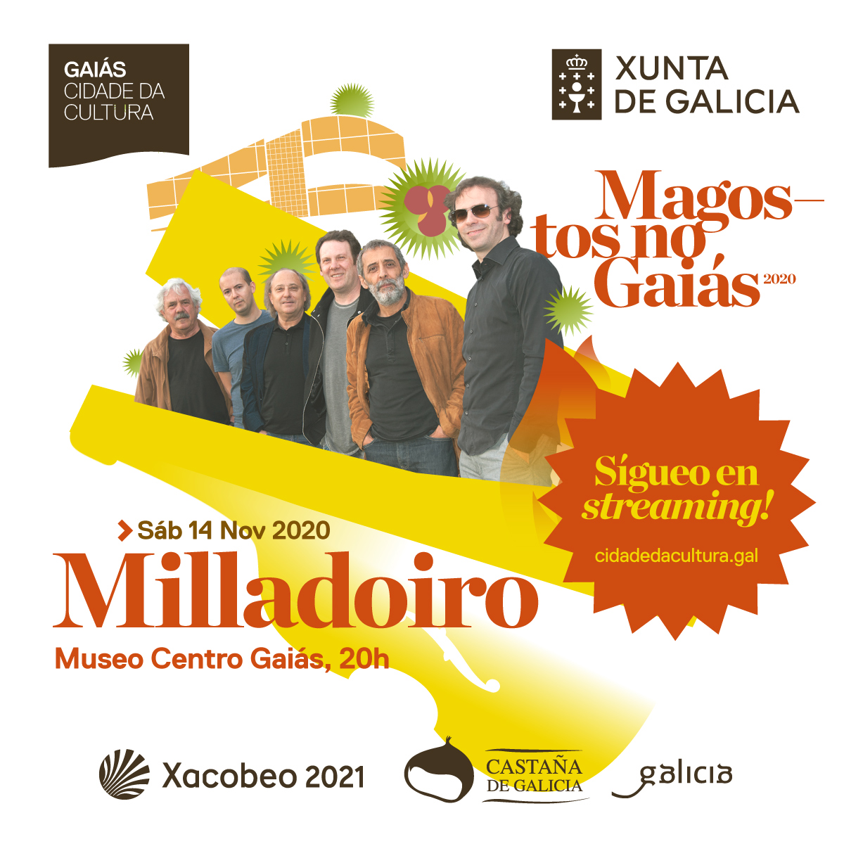 Lo celebramos repartidos en tres sábados y en cada uno dellos con una muestra de la mejor música gallega, con tres conciertos que evidencian la alta calidad y versatilidad de estilos en Galicia, ya que el Museo Centro Gaiás acogerá la actuación de Luar na lubre (24 de octubre), una de las formaciones tradicionales con más prestigio de Galicia; con Sumrrá (31 de octubre), referentes del jazz contemporáneo, también fuera de nuestras fronteras; y Milladoiro (14 de noviembre).