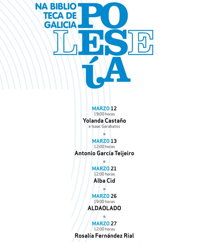 Solas o acompañadas de música —como en el caso de Yolanda Castañao con el guitarrista y compositor Isaac Garabatos— de imágenes o de la palabra de otros creadores de su elección, cinco escritores realizarán una lectura de las poesías, propias o ajenas, que consideren mejores para celebrar los diez años de la Biblioteca de Galicia. En esta programación especial por el décimo aniversario de la Biblioteca de Galicia no podía dejar de tener protagonismo el género literario que le dió a nuestras letras algunas de sus obras más destacadas.