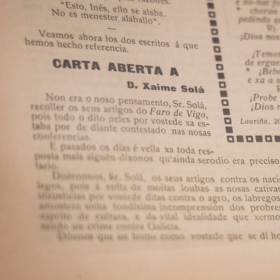 | En la muestra, comisariada por las técnicas de la Biblioteca de Galicia Ángela García Núñez y Charo Alonso Cerdeiras, se pueden encontrar números de la revista donde se debate sobre el uso del gallego, en cartas abiertas entre Solá y Risco, Diéguez y Noguerol. A pesar de que la publicación estaba mayoritariamente en castellano, había personas, como ellos, que escribían en gallego. La exposición deja entrever que, aunque los artículos eran de corte conservador, la ilustración permitía mayor espacio para la crítica, algo que se observa en algunas portadas realizadas por Castelao, Álvaro Cebreiro o Padín a lo largo de los años de vida de la revista. | ![]() |