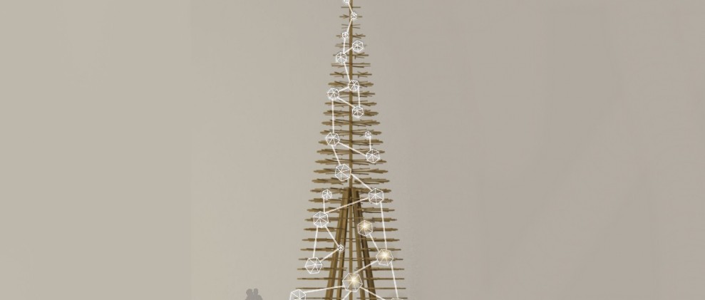 A idea desta proposta de Marta Verde é levar ese concepto de camiño, de comunicación, de interacción social --cun elemento tan simple pero tan potente como a luz-- á unha instalación fixa intervindo a árbore previamente deseñada polo estudio Nómada.