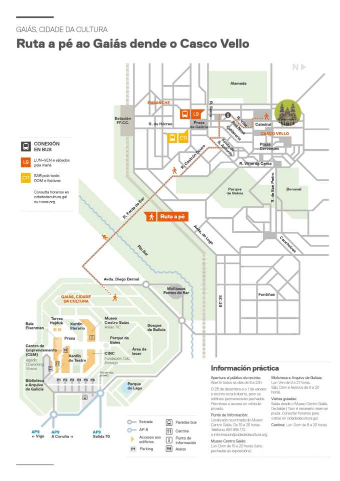 E unha vez no cumio do Gaiás, agarda por ti a Cidade da Cultura de Galicia cunha ampla e variada oferta cultural de 10 a 20 horas: tanto expositiva, no Museo Centro Gaiás, como de actividades, á vez que áreas de lecer, como o Parque da Balea; de esparcimento como o Xardín Literario e recentemente estreado Xardín do Teatro; de restauración como a Cantina do Gaiás. Consulta toda esta información en cidadedacultura.gal