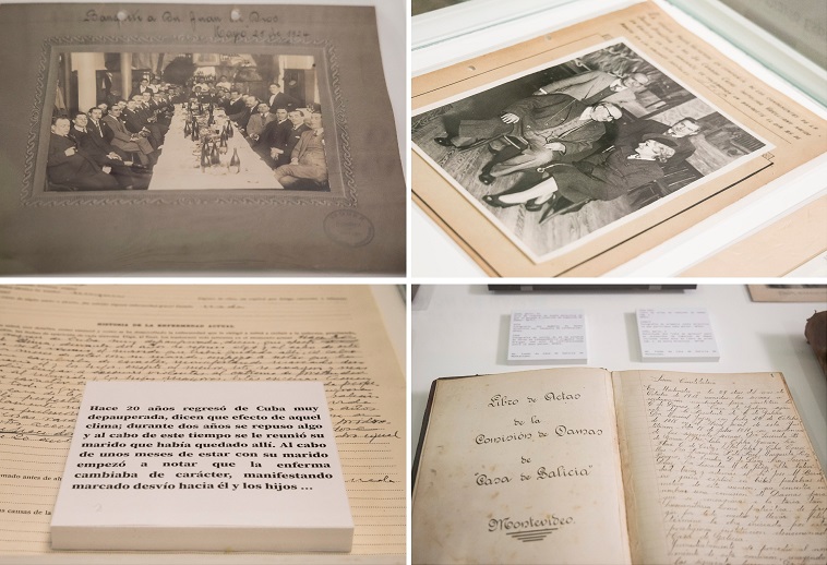 Os documentos que se exhiben en seis vitrinas proceden, maioritariamente, de dúas asociacións nacidas para ser punto de encontro dos galegos fóra da súa terra: unha en Uruguai (A Casa de Galicia de Montevideo, nacida en 1917) e a outra en Barcelona (Asociación “O Penedo” Fogar Galego, fundada nos anos 80). Xunto a eles se exhiben tamén historias clínicas do Hospital Psiquiátrico de Conxo e diferentes testemuños das relacións coas comunidades galegas levadas a cabo pola Administración autonómica desde os primeiros momentos da súa creación.