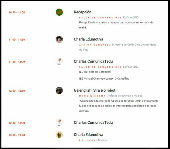Nesta primeira edición, a mañá adicaráselles aos máis novos. Os asistentes poderán gozar de dúas charlas realizadas por persoeiros relevantes que participan no proxecto Edumotiva. Ademais, tamén subirán ao escenario os gañadores e gañadoras do concurso ComunicaTedu (certame sobre oratoria nas aulas) para compartir a súa experiencia e o seu discurso.