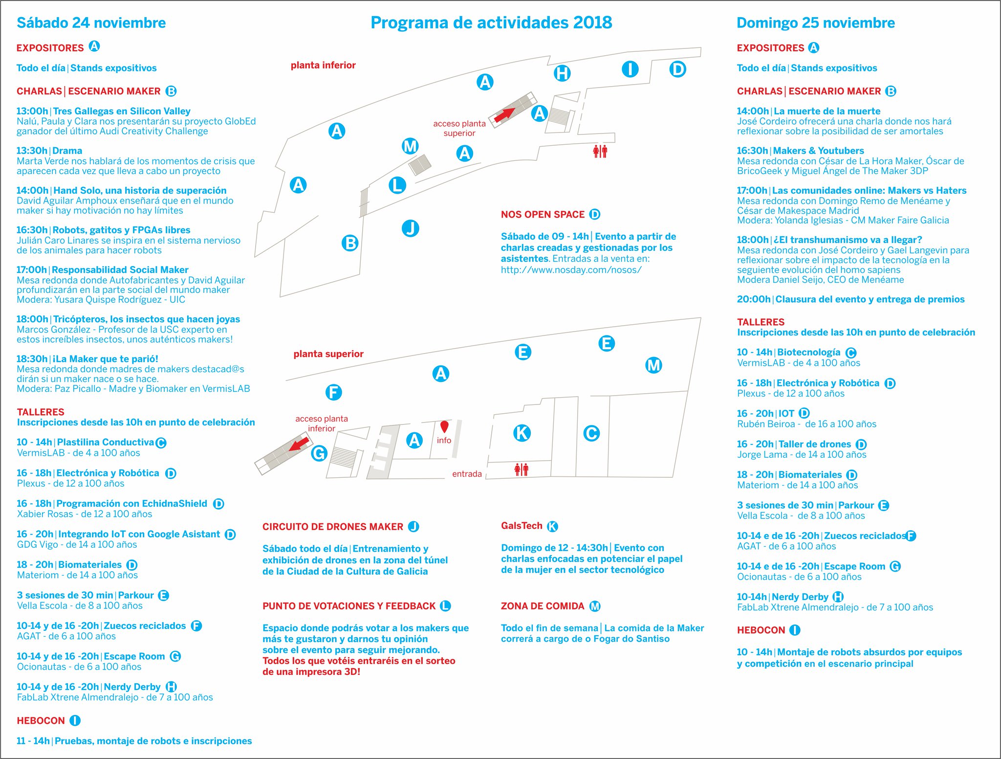As inscricións dos talleres realizaranse durante a propia feira, no espazo de celebración do mesmo, a partir das 10 h da mañá. A asistencia ás charlas e mesas de debate serán sen inscrición previa, ata completar o aforo, salvo no caso de NOS Open Space, tal e como se indica no programa.