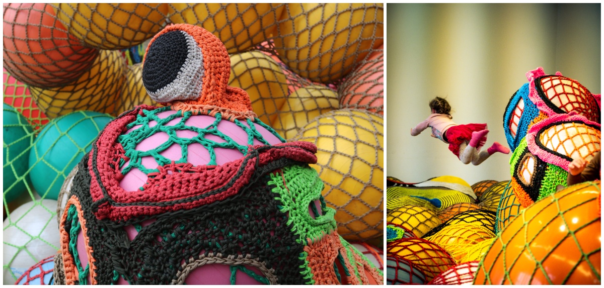 Todo comezou cando Bertel decidiu envolver cun patrón de tecido de gancho a súa propia pelota para sentarse... sen ter nin idea de que iso acabaría levando á creación de enormes instalacións cheas de cores e formas divertidas! Espazos que empregan materiais como pneumáticos, teas e fíos elásticos, construídos artesanalmente para producir obras nas que nenos e nenas poden explorar de xeito autónomo.