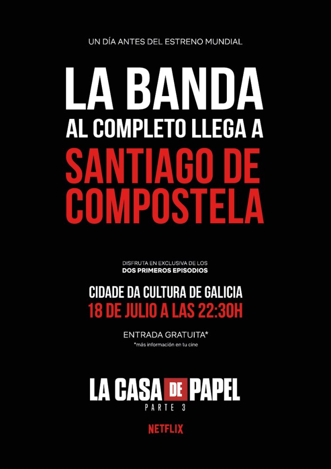 Se es seareiro ou seareira de La Casa de Papel, o 18 de xullo ás 22.30h, tes que estar na Cidade da Cultura de Galicia‼️ Proxectamos na praza exterior os dous primeiros episodios da nova tempada desta existosa serie de Netflix, un día antes da súa estrea mundial‼️