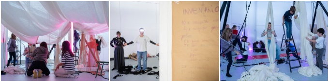 A directora e coreógrafa Marta Alonso Tejada, o arquitecto Juan Rodríguez, e a artista visual Laura Iturralde, co apoio da profesora da USC Cristina Portela, investigan como integrar a participación da cativada, familias e docentes na construción de escenografías para o xogo e a aprendizaxe. Un laboratorio de experimentación no que participan tamén as bailarinas María de Vicente e Inés Santos, e que servirá de base para a futura peza de danza, Abúrrome.