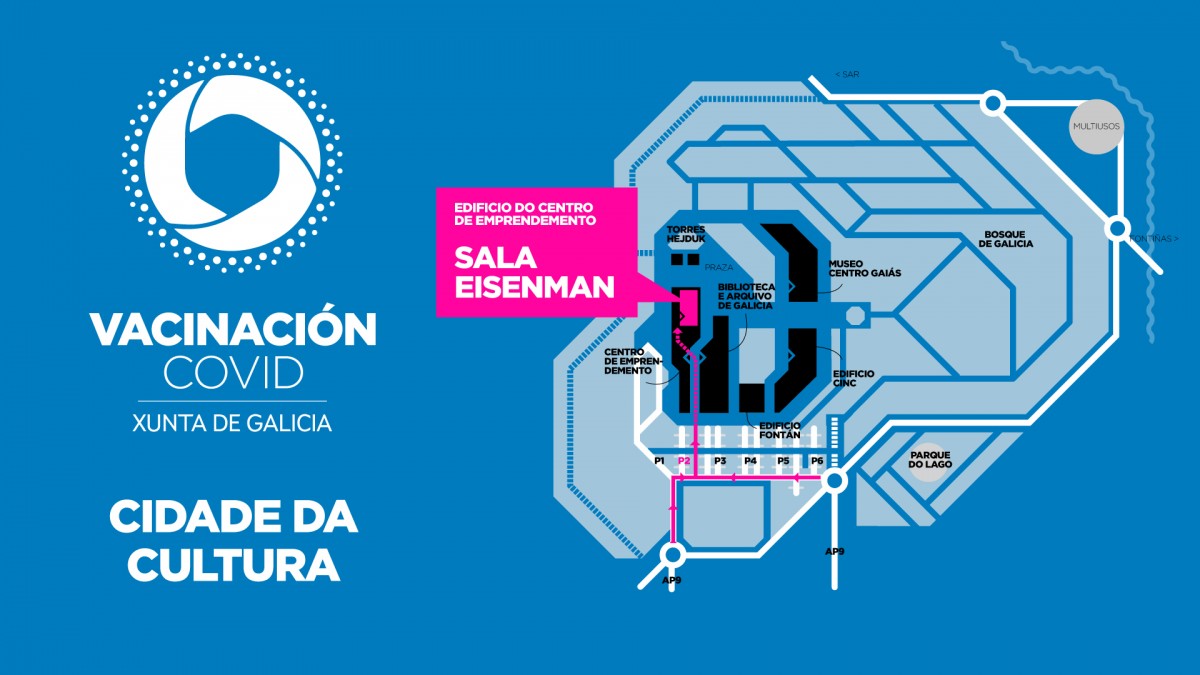 A Consellería de Sanidade elixiu a Cidade da Cultura como un dos puntos da vacinacion masiva contra a covid-19. Desde o pasado 6 de abril estáse a convocar na Sala Eisenman e através do acceso dos aparcamentos 1 e 2