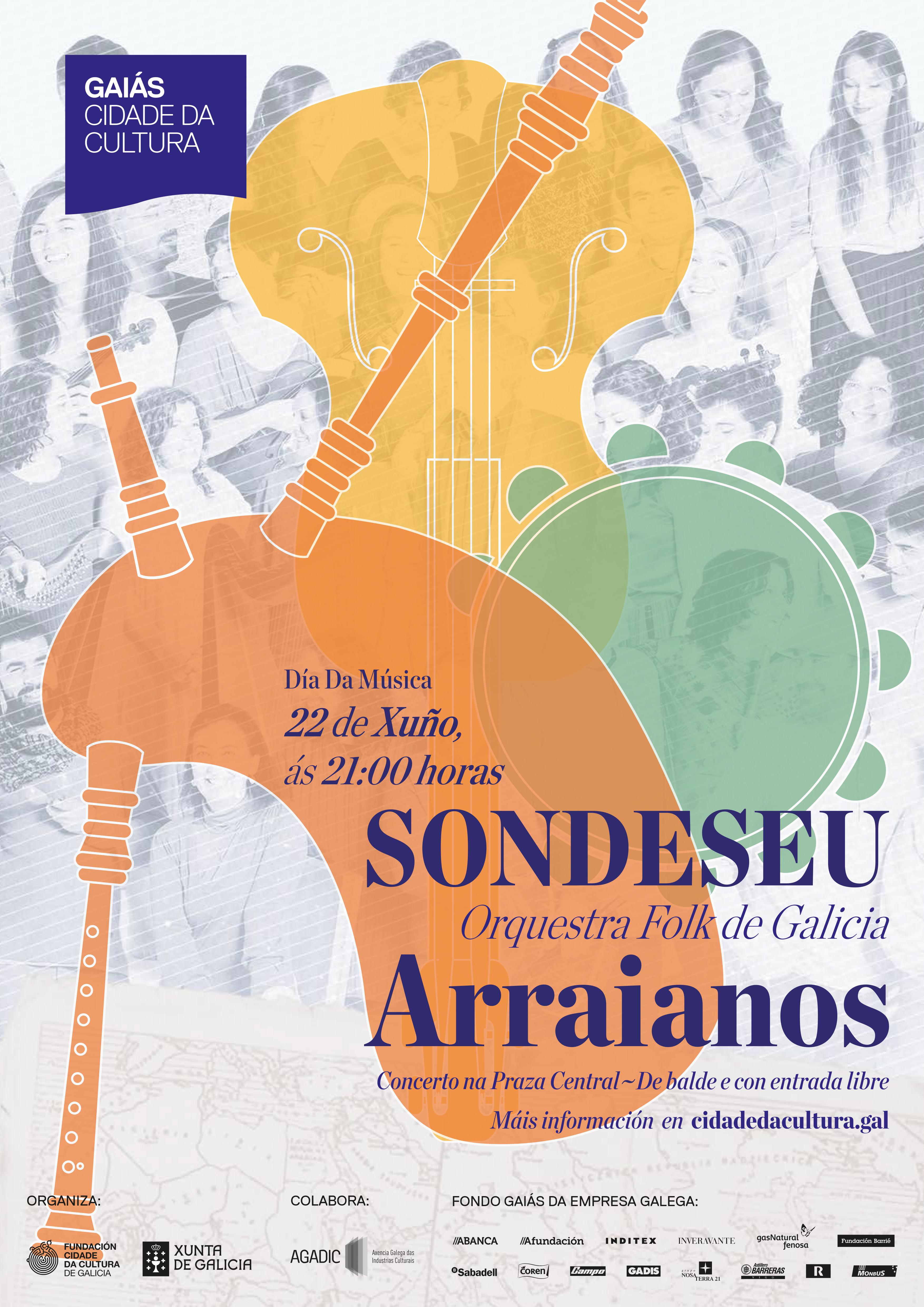 O Gaiás acollerá o vindeiro venres 22 de xuño un concerto de SondeSeu para conmemorar a celebración do Día da Música e darlle a benvida ás longas noites do verán e a toda a programación estival do complexo, da que a música é o prato forte. A Orquestra Folk de Galicia subirá ao escenario da Praza Central do Gaiás ás 21 horas para presentar, por vez primeira en Galicia, o seu espectáculo Arraianos, nun concerto con entrada libre e de balde organizado pola Fundación Cidade da Cultura coa colaboración da Agadic.